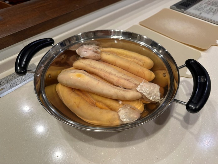 先ずは血を抜くためにマチ針で約1センチ間隔に