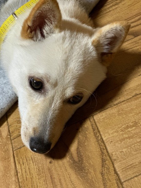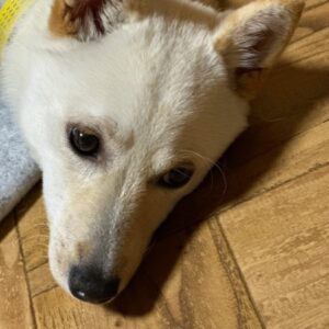 母の家で吟侍(わんちゃん)の頭をなでなでしながら